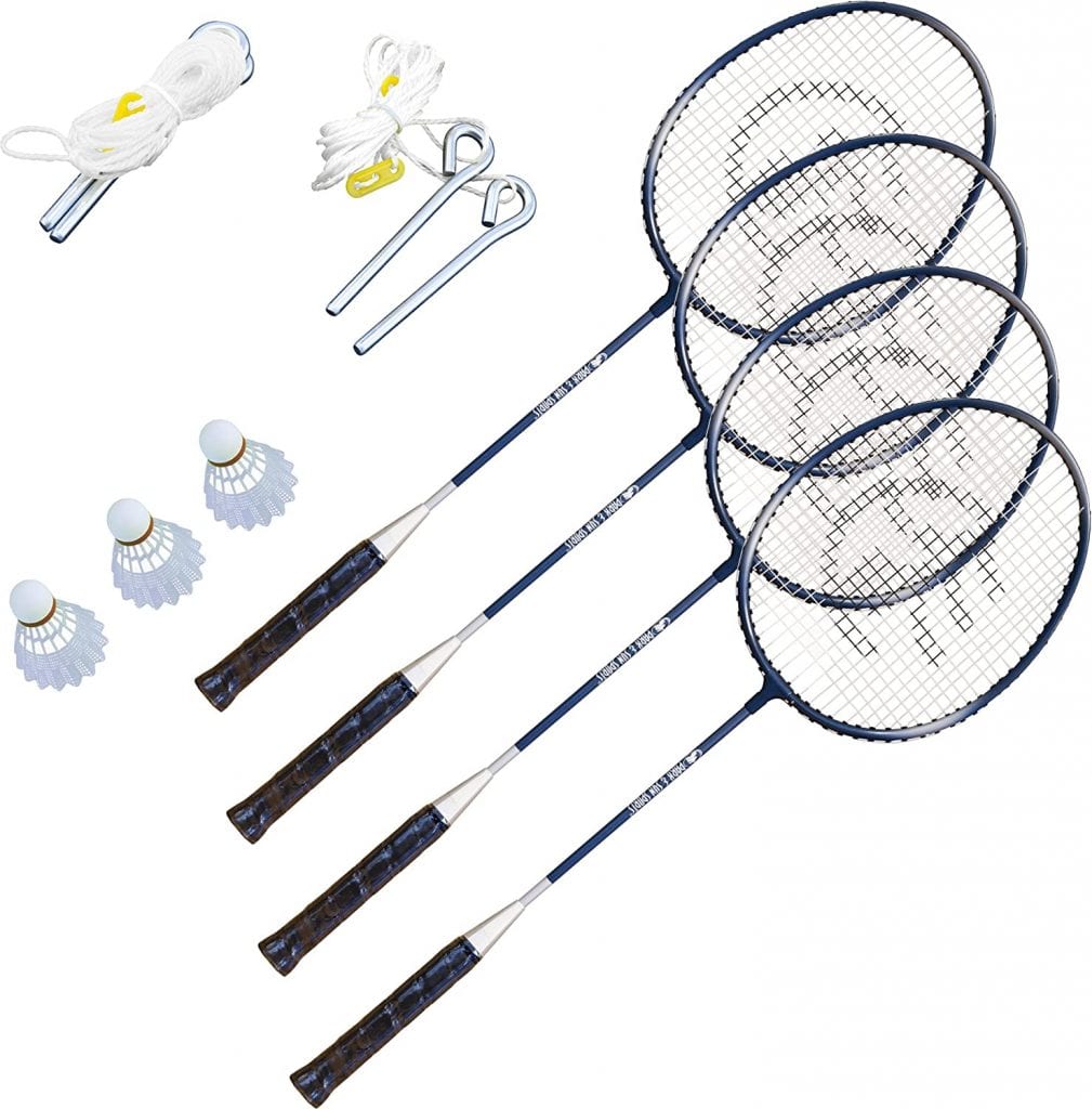 “This Park & Sun Badminton set is well-made and easy to set up. It comes complete with four rackets and three birdies as well as the net, poles, guy ropes and a perimeter boundary rope.I didn’t use the boundary rope as I was able to spray paint lines onto the grass. The rackets could use better grips than the hard plastic ones but certainly decent to be included in a full package like this.”