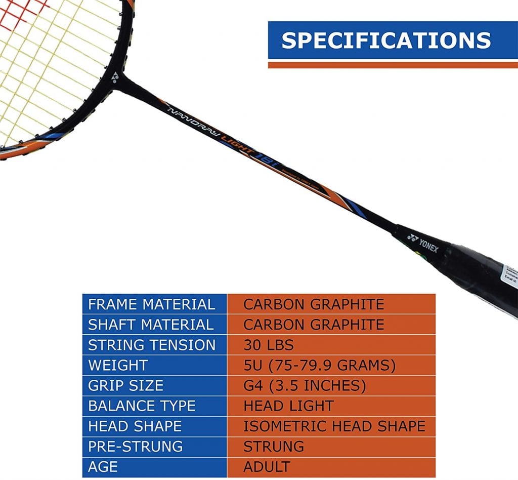 The Yonex Nanoray Light 18i badminton racquet is developed in Japan and made in China featuring Nano mesh with carbon nanotube which is an exclusive structural material inserted into the frame and/or shaft of the Nanoray series. This new type of material creates a mesh-type material structure that gives the players a very light but rigid badminton racket structure, a lightweight racket that helps in placing better drive shots, better racquet strength and handling, and improved repulsion power and strength.